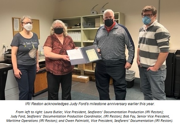 Judy Ford, based in the Reston office celebrated 20 years with IRI in February 2022. She joined the seafarers’ documentation team in 2002 as a Data Entry Clerk. Through her hard work and dedication, she completed the test for the Documentation Evaluator position and was promoted in 2007. In 2014, Judy was again promoted to Documentation Production Coordinator. In this role Judy has helped strengthen the seafarer documentation departments of other regional offices, further decentralizing these activities to support clients worldwide.